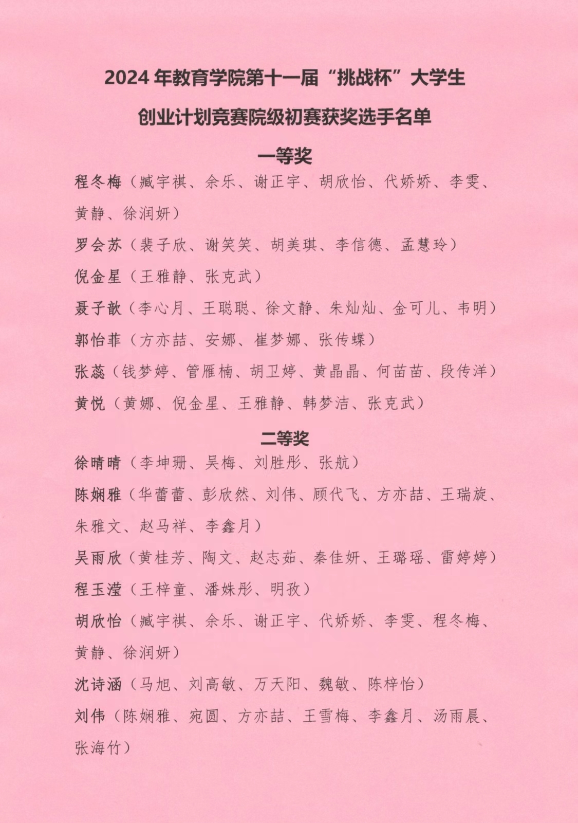 2024年教育学院第十一届“挑战杯”大学生创业计划竞赛院级初赛获奖选手名单