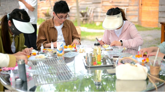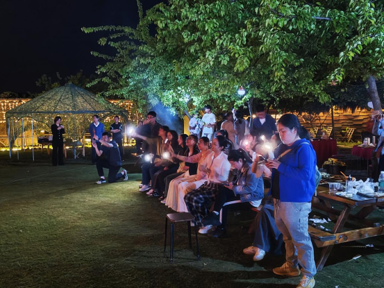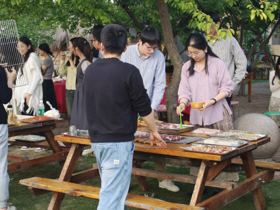 晚餐时间,大家围坐在餐桌前一起动手制作烧烤,享受露天烧烤带来的小确幸。饭后,学院英语教研室陈博识老师倾情献唱,用一场轻松欢快的草坪音乐将本次踏青活动推向高潮。