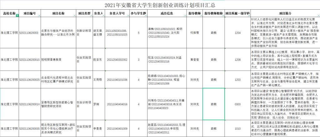 2021年安徽省大学生创新创业训练计划项目立项名单