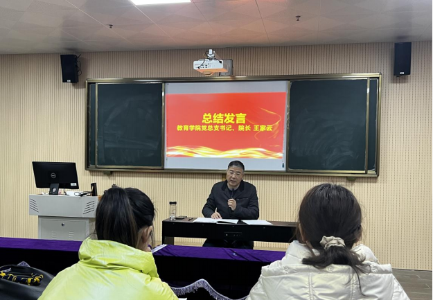 最后,教育学院党总支书记王家云同志对此次会议做出点评和总结,肯定了我院教师的工作业绩,强调支部能够密切联系党员群众的实际情况,全面充分、诚恳认真的进行批评与自我批评,体现了良好的政治风貌,为后续工作的开展打下了良好的基础。希望在后续工作中增强理论学习的时间及研究的深度,以“四有好老师”的标准成为学生的“四个引路人”;鼓励青年教师注意教学方式方法,提升科学研究水平,增强同事交流,互通有无,落实“学生发展中心”的理念,解决教学中的难题,要在行动中见效。