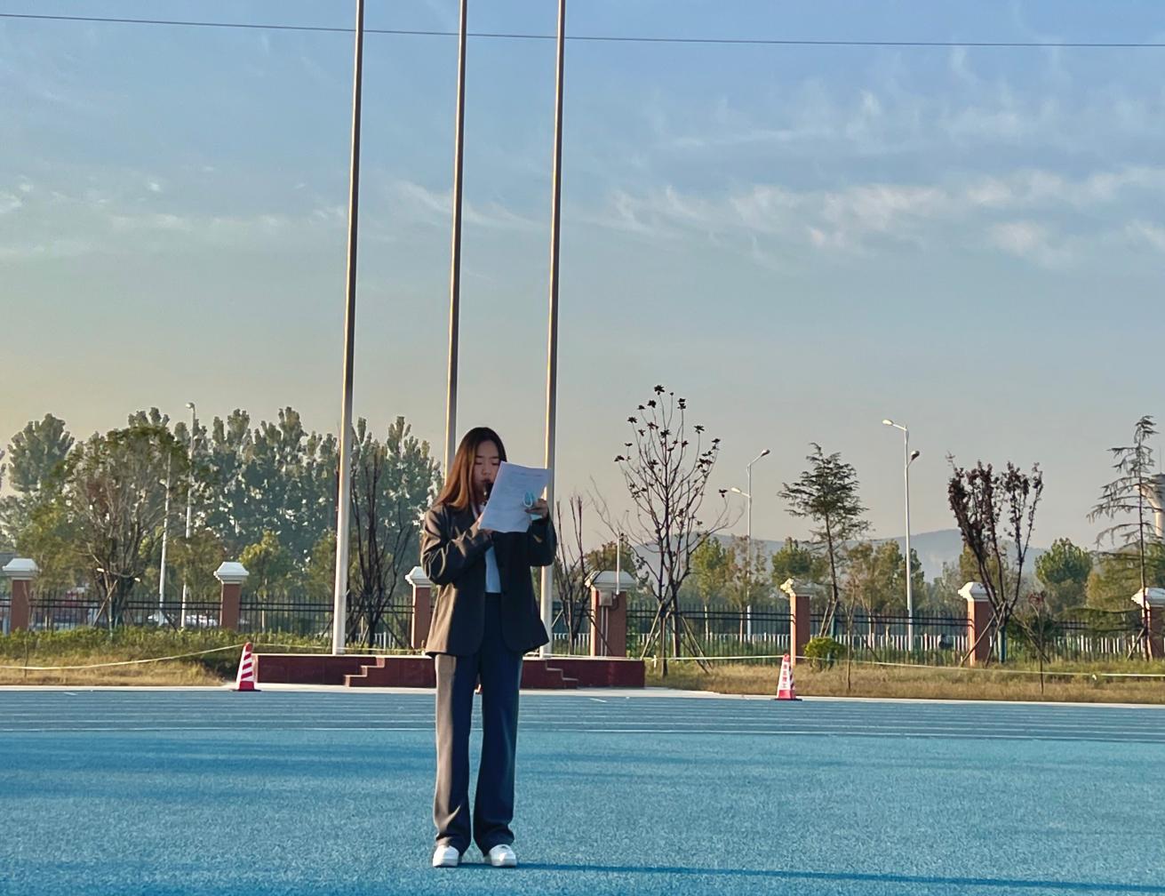 升旗完毕,新生专升本学生王灿作为学生代表发言,她说正处在人生黄金时期的大学生应该珍惜时间,热爱学习,努力成为社会主义的合格建设者和可靠接班人!让青春在全面建设社会主义现代化国家的火热实践中绽放绚丽之花。
