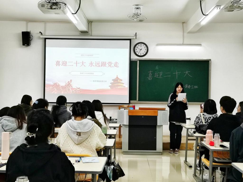 以青春之声传递精神力量,以实际行动奏响复兴之曲。同学们在认真学习、理解的基础上,用自己的语言把党的二十大精神制作成PPT讲稿,在班级进行宣讲。11月4日晚,学院举行理论宣讲比赛,经评选,陈可欣、黄悦等5人获得一等奖;安娜、姜甜甜等10人获得二等奖;杜越、邓雯莉等15人获得三等奖。后续将从这些获奖的PPT作品中选出青年宣讲团,组成“党的二十大精神”志愿宣讲团,深入社区、基层宣讲党的二十大精神。