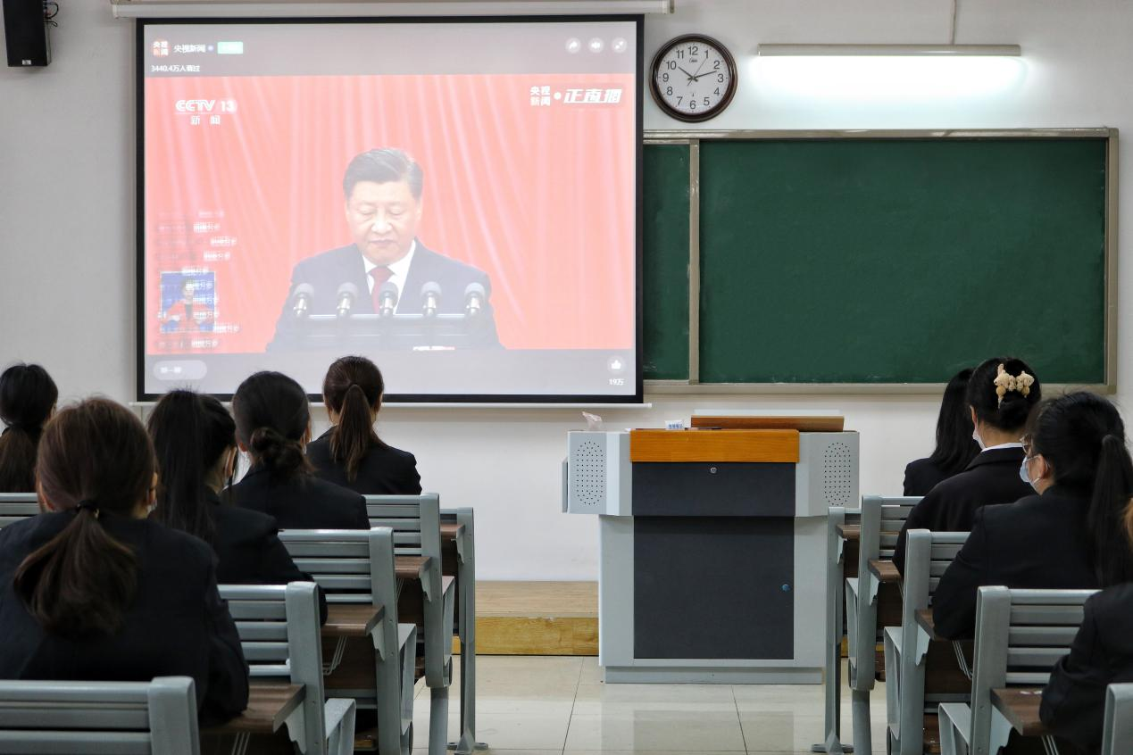 10月16日上午,学院组织学生党员、学生代表分别在第二教学楼412教室、413教室、414教室、415教室集中观看党的二十大开幕会盛况。参加活动的学生党员、学生代表身着正装、佩戴党员徽章、团徽和口罩,全神贯注、认真聆听大会内容。学生代表听完报告后激动地说:习近平总书记对广大青年的殷殷嘱托使我们感受到自己所肩负的使命之重大、号召之强烈。作为新时代青年,我们应当将个人梦想与实现民族伟大复兴的中国梦相结合,以昂扬的姿态在青春的赛道上奋力奔跑。