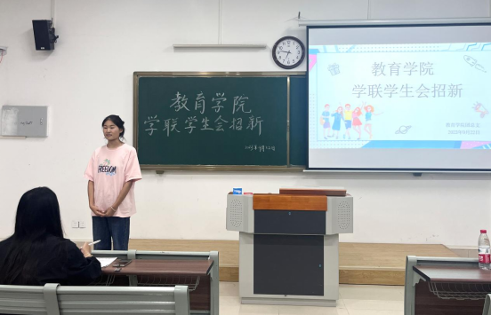 为丰富校园文化生活,发展学生会新成员,优化学生管理队伍建设,积极为23级新生提供才华展示、才能锻炼的舞台,9月22日下午6点,教育学院学联学生会招新活动在一号教学楼113、114、115教室进行,教育学院书记助理黄莹莹、团总支副书记许海涛、辅导员郭鸿鑫老师到达招新现场进行指导工作。