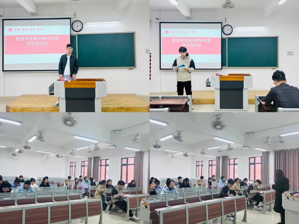 按照学校“关于开展2023-2024第一学期期中教学检查的通知”精神,教育学院于11月15日下午在1号教学楼41O、411教室分年级召开了学生座谈会,倾听同学们对教学的意见和建议。学院分管副书记孟向红、书记助理黄莹莹、团总支副书记许海涛、辅导员郭鸿鑫、高伟参加会议,黄莹莹、许海涛分别主持了会议。
