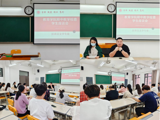为全面掌握教学运行情况,切实保障教育教学工作质量,进一步加强师生间的沟通交流。教育学院于4月28日晚在2号教学楼306、307、308、309教室分专业召开期中教学检查师生座谈会,数学与应用数学、英语、汉语言文学、学前教育等四个专业的教研室主任、教师代表、学生代表参加了座谈会。会议分别由学院书记助理黄莹莹、辅导员彭慧敏、高伟和张颖颖主持。