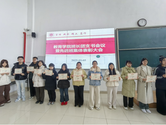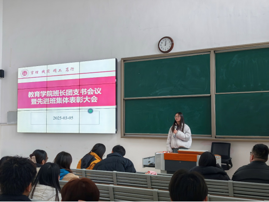 为促进班级管理交流,增强各班学生干部工作能力和激励全院班级努力营造良好班集体氛围。3月5日中午,教育学院在一号教学楼121教室开展了“班长、团支书会议暨先进班集体表彰大会”。会议由学院团总支副书记许海涛主持,分管副书记孟向红、书记助理黄莹莹、24级全体辅导员以及各班班长、团支书参加了会议。
