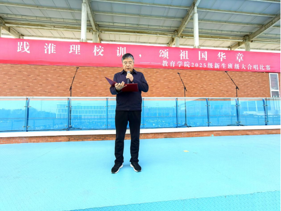 为弘扬爱国主义精神,厚植家国情怀,引导2025级新生深入理解并自觉践行校训精神,10月29日下午,教育学院在操场举办“践淮理校训,颂祖国华章”2025级新生班级大合唱比赛。2025级共30个班级1000多名同学组成15支队伍参加比赛。学院党总支书记(院长)王家云、分管副书记孟向红、副院长谢贤德、校团委书记刘帅克、学院全体辅导员以及2025级全体新生共同参加了本次活动。