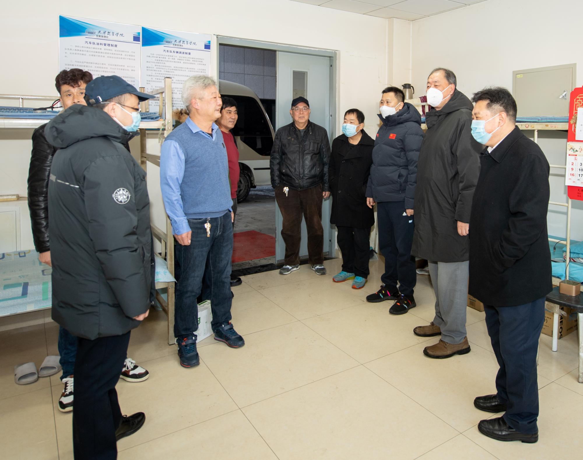 2022年1月31日(农历除夕)上午,校领导王欢、吉承恕、张立顺、张欣、宋爱军、张卫国一行,先后来到团泊校区的行政值班室、能源站、车队值班室、学生宿舍楼、图书馆、综合服务楼,以及河西校区的保卫室、楼宇物业室、变电站等地,专程看望慰问在春节假期仍坚守工作岗位的学工、网信、后勤、保卫、基建等教职员工,向他们致以诚挚的问候和虎年新春祝福,并送上春节慰问品。