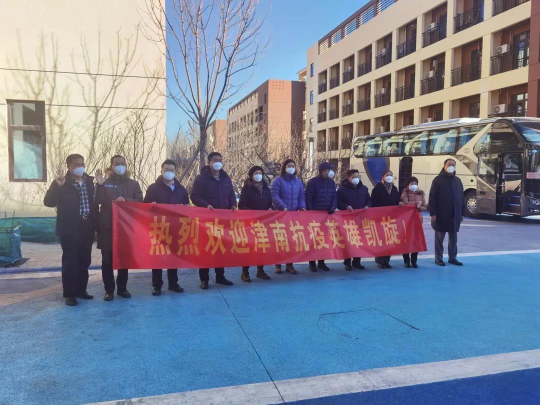 1月29日下午,津蓟高速繁忙而有序,一辆辆客车依次驶过,车身上悬挂的欢迎英雄凯旋的横幅迎风招展,全市2000名支援津南抗疫的机关事业单位干部结束在宝坻的集中隔离,由各单位接回。在宝坻集中隔离点门口,我校党委副书记、院长吉承恕和有关部门、单位负责同志组成的迎接团队,热烈欢迎圆满完成津南抗疫任务的我校20名党员干部教师凯旋,学校安排两辆专车统一转运,一一护送到家。