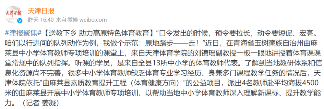 日前,我校教师赴青海省玉树藏族自治州曲麻莱县,为当地中小学体育教师开展专项培训。包括人民网、中国教育新闻网、天津日报新媒体、北方网、津云、天津教育报新媒体等在内的中央和我市多家媒体,对此进行了报道。