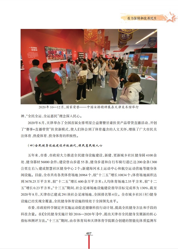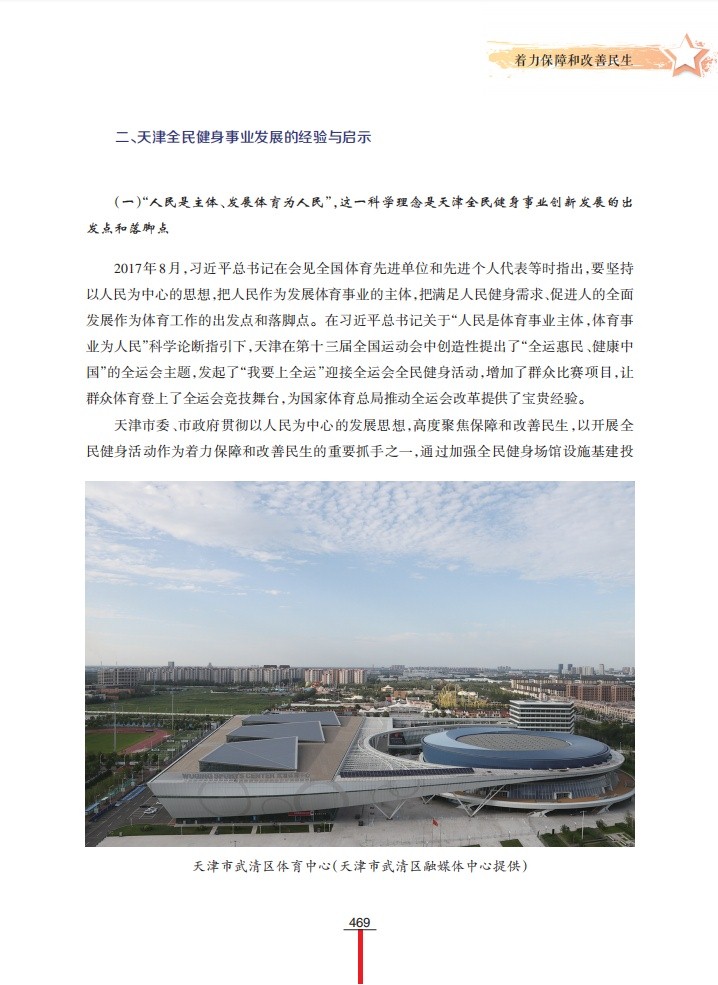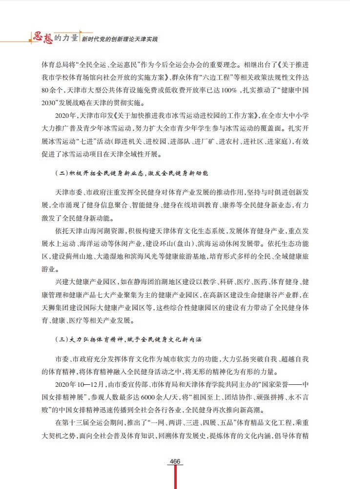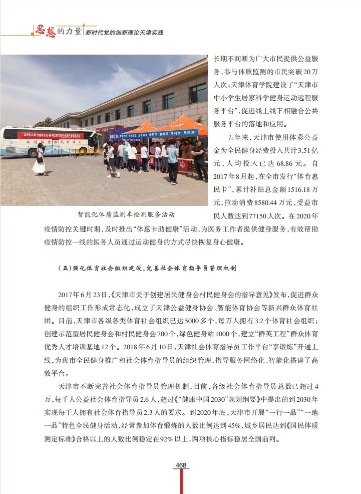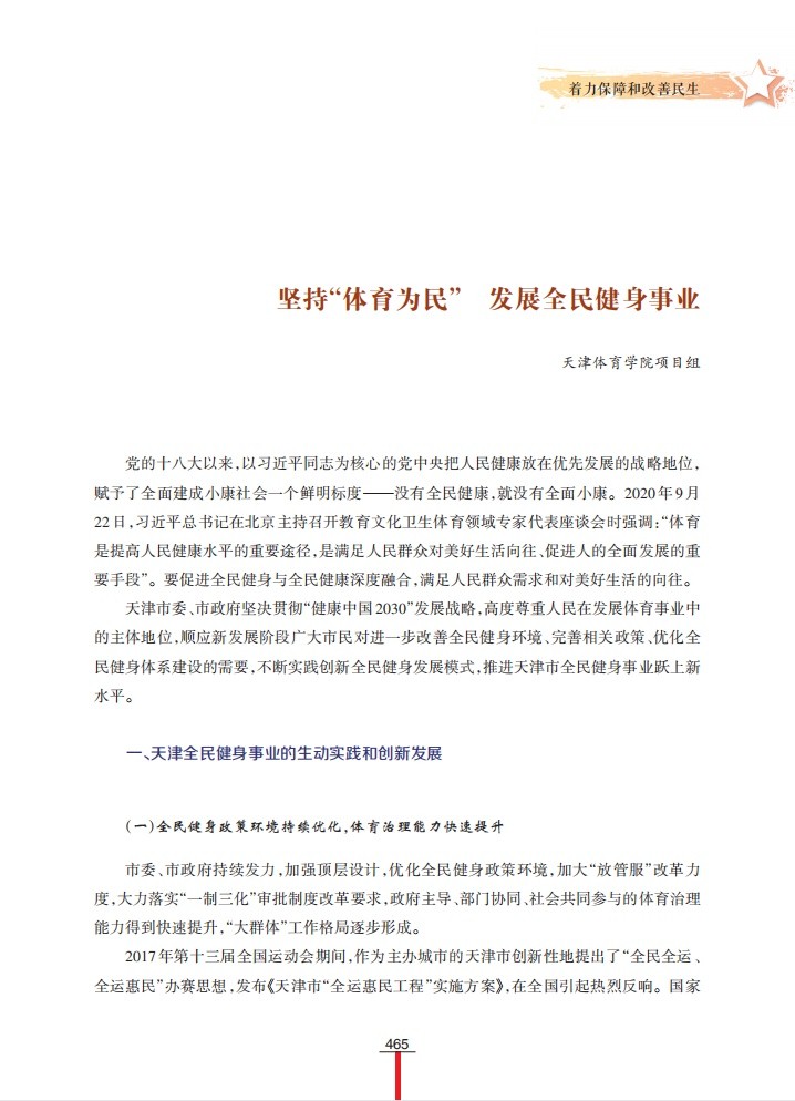 该调研成果着眼天津全民健身事业发展中取得的成果和经验,系统梳理天津全民健身事业在政策环境、文化内涵、硬件条件、社会组织等方面实践及成效,对天津全民健身事业发展经验进行了多方位的总结;在此基础上,从创新工作格局、发展智能健身、弘扬体育精神三个方面,提出新时期天津全民健身事业发展的对策建议。