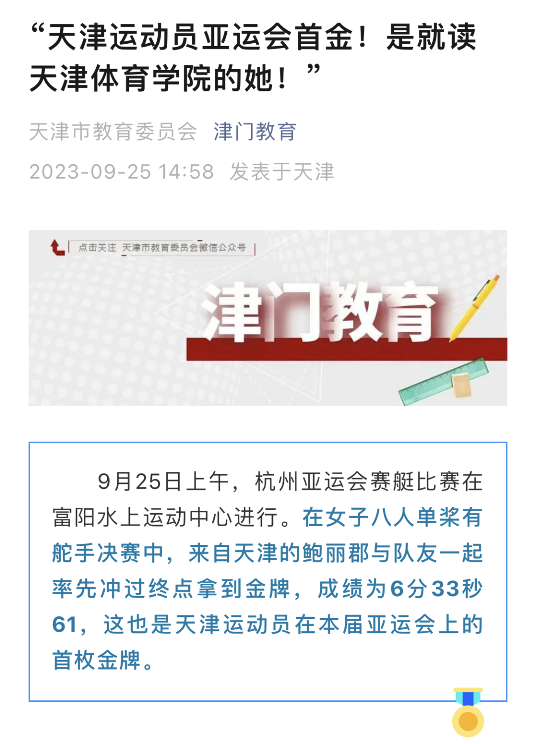 9月25日,杭州第19届亚运会赛艇女子八人单桨有舵手决赛中,我校学子鲍丽郡充分发挥技战术水平,与队友协同配合、不畏强手、顽强拼搏,以绝对优势第一条艇冲过终点,摘得该项赛事金牌。这是中国体育代表团在亚运会上收获的第1500枚金牌,是天津在本届亚运会上获得的首金。央视新闻、新华社客户端、中国新闻网、《天津日报》、津云、北方网、《今晚报》、津门教育等中央和我市多家媒体对此进行了报道。