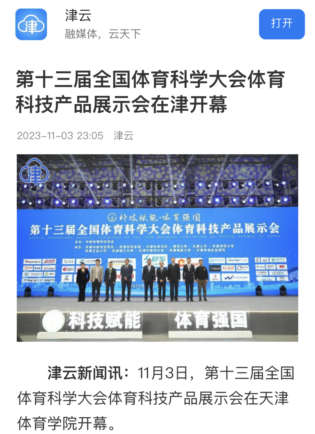 2023年11月3日下午,第十三届全国体育科学大会体育科技产品展示会在天津体育学院隆重开幕。新华社、央广网、国家体育总局官网、津云、北方网等中央和我市多家媒体对此进行了报道。