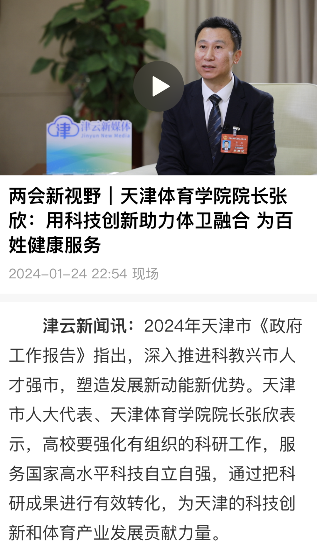 日前,津云《两会新视野》专访天津市人大代表、天津体育学院院长张欣。张欣表示,高校要强化有组织的科研工作,服务国家高水平科技自立自强,通过把科研成果进行有效转化,为天津的科技创新和体育产业发展贡献力量。