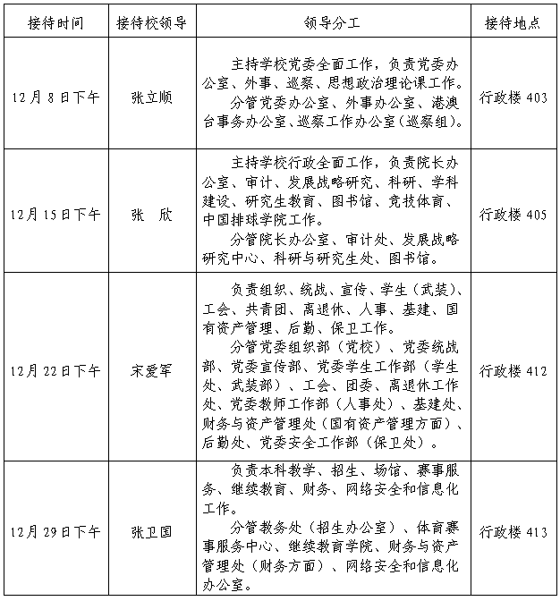 根据《天津体育学院领导干部接待日制度》规定及学校近期工作安排,现将2022年12月校领导接待师生来访安排通知如下。