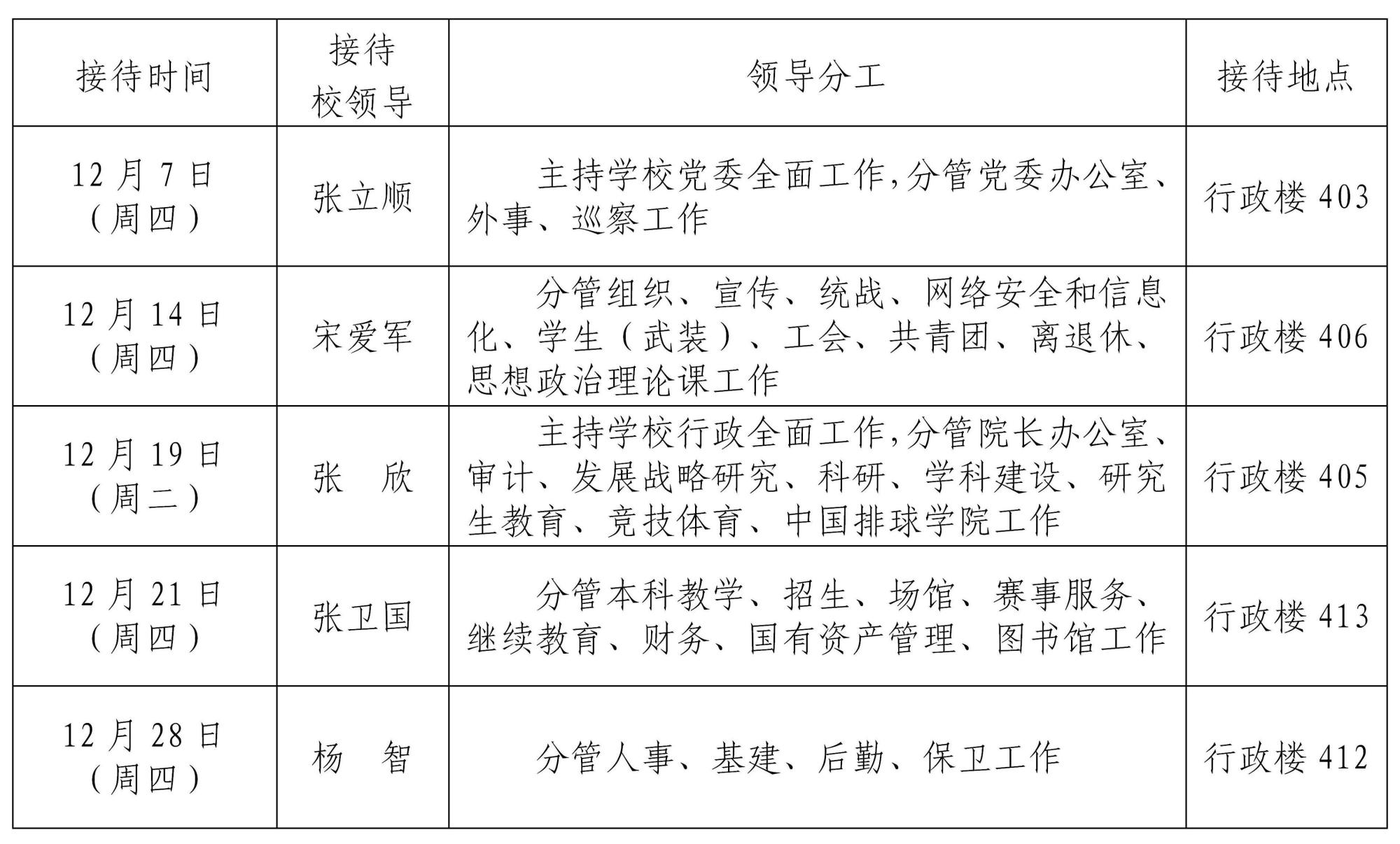 根据《天津体育学院领导干部接待日制度》规定及学校近期工作安排,现将2023年12月校领导接待师生来访安排通知如下: