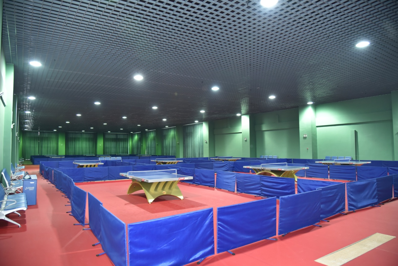 乒乓球馆建筑面积7277平方米,场地面积4868平方米,共四个球馆,72张国际标准的比赛球台,地面采用塑胶材料铺设,馆内有良好的照明系统、馆内温度和空气的流速都可以较好地控制,可承接各类乒乓球项目比赛和健身活动
